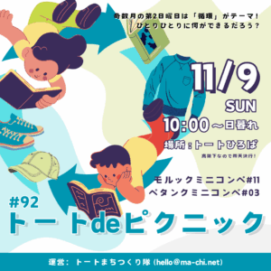 次回の「トートdeピクニック」の開催日について 投稿日 2025年10月11日 著者 まちつくり隊 カテゴリー ピクニック 次回の開催は11/9(日)です! 毎月第2・4日曜日に実施している「トートdeピクニック」10月第4日曜日は開催しない運びとなりました。次回は11/9(日)に開催予定です。 引き続き「トートdeピクニック」をよろしくお願いいたします。